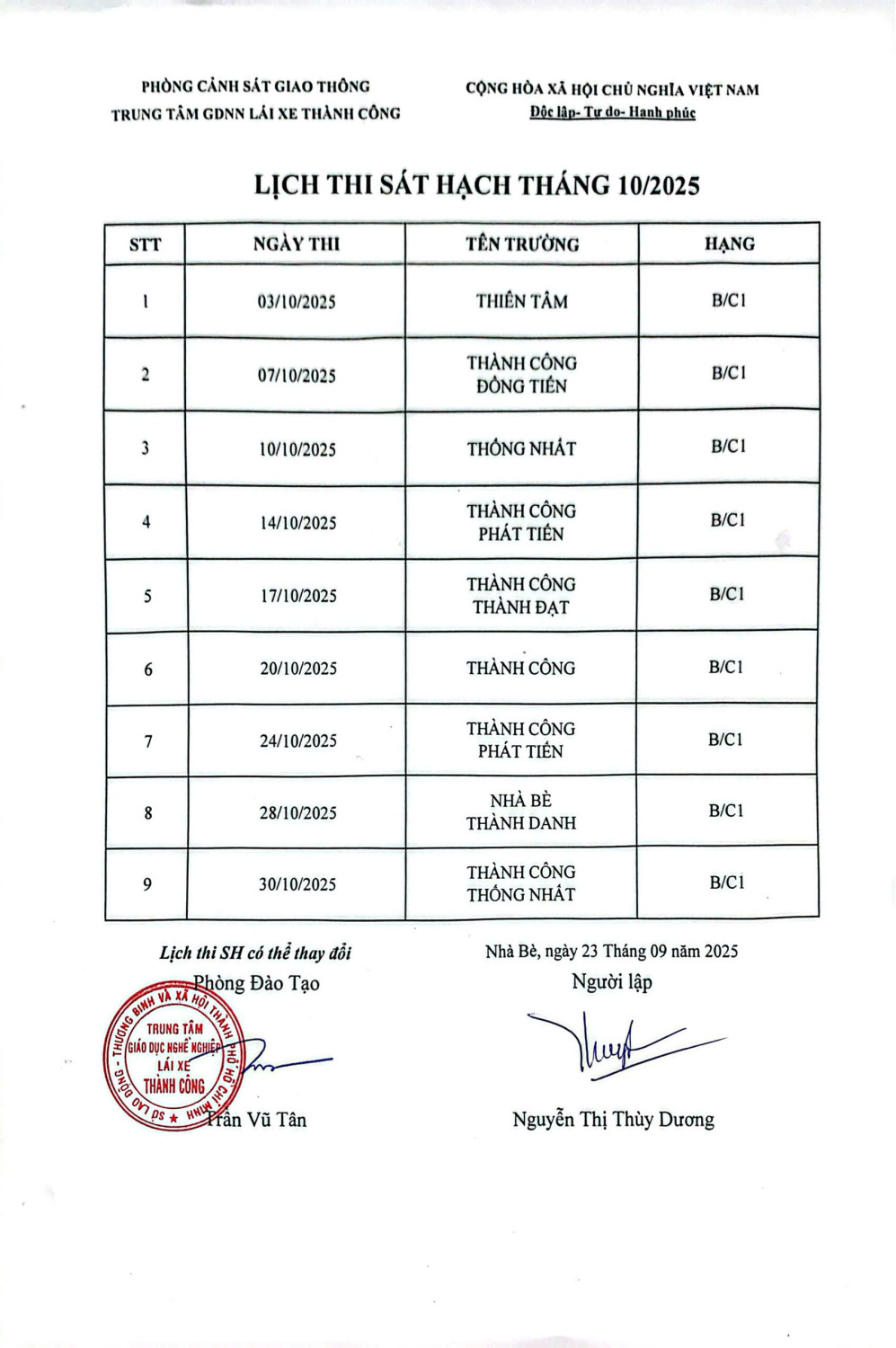 LỊCH THI SÁT HẠCH THÁNG 10/2025